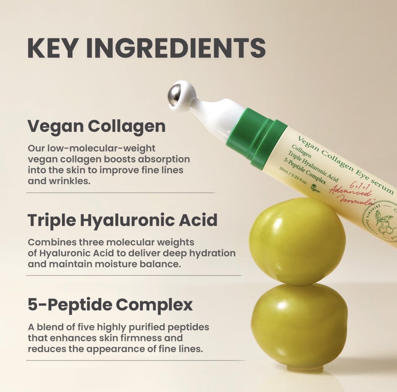 – مع الكولاجين النباتي ومركب 5-ببتيد، فإنه يحسن مرونة الجلد.