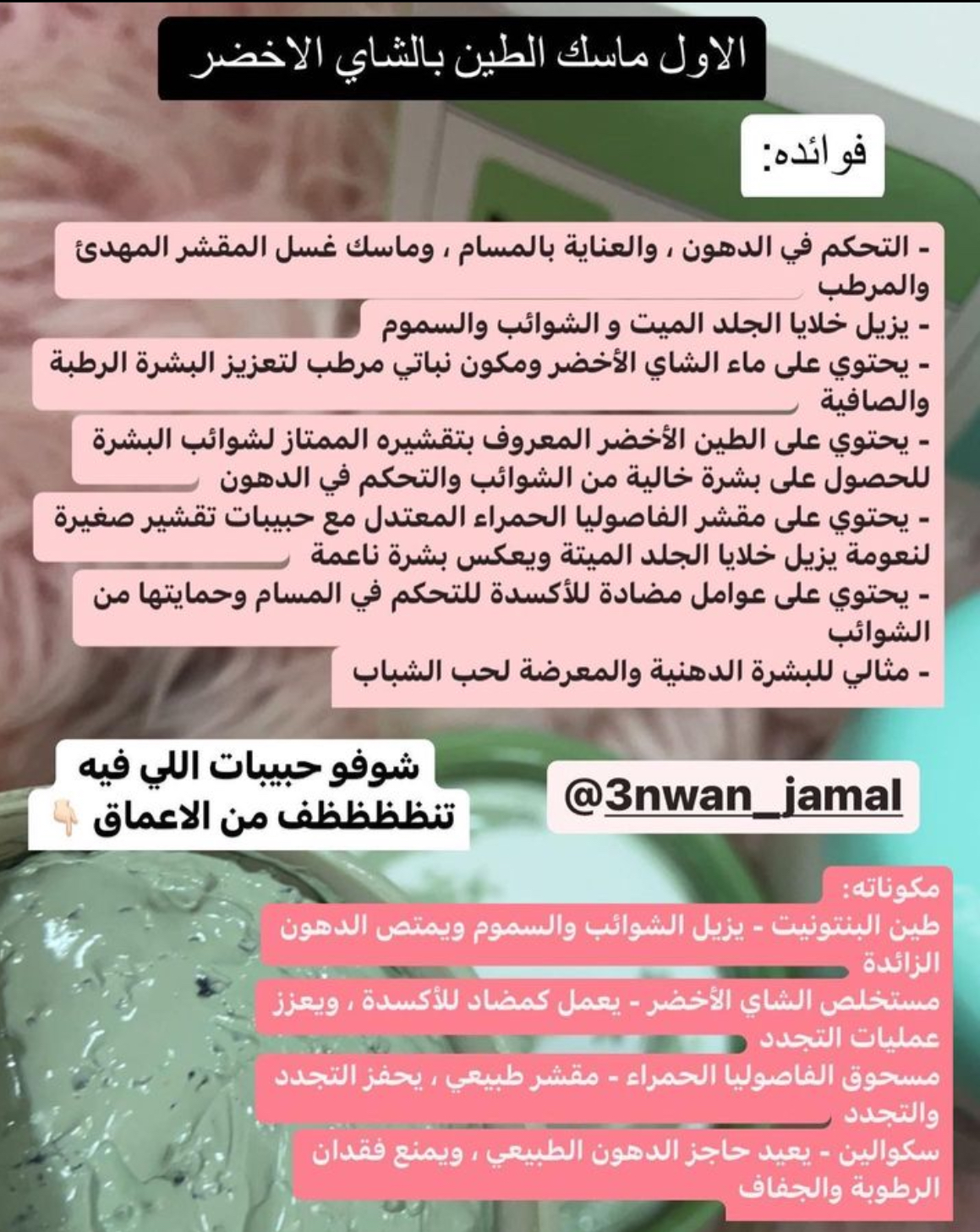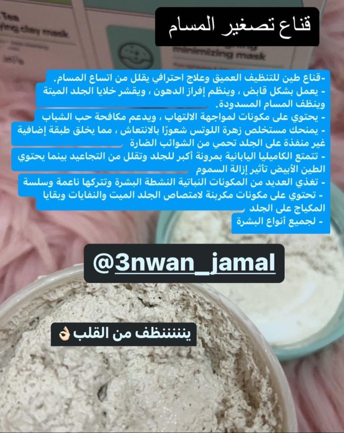 – قناع طين للتنظيف العميق وعلاج احترافي يقلل من اتساع المسام.