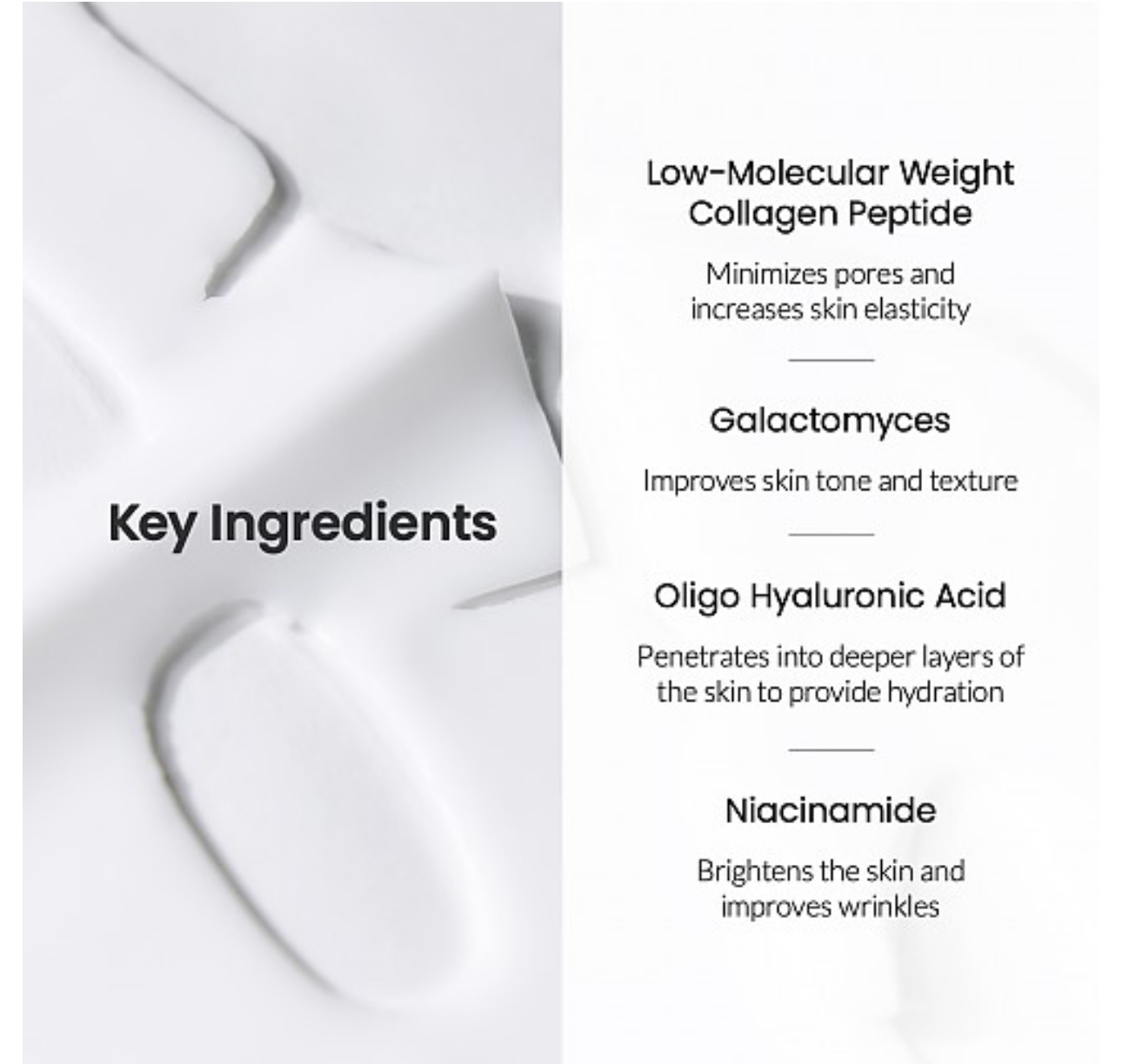 شد المسام وشدها: يزيد الكولاجين الجزيئي المنخفض للغاية من تغلغل الجلد وامتصاصه. إنه يصقل المسام المتضخمة، ويحسن مرونة الجلد على الفور بعد التطبيق وينعم مظهر الخطوط الدقيقة والتجاعيد بشكل واضح.
